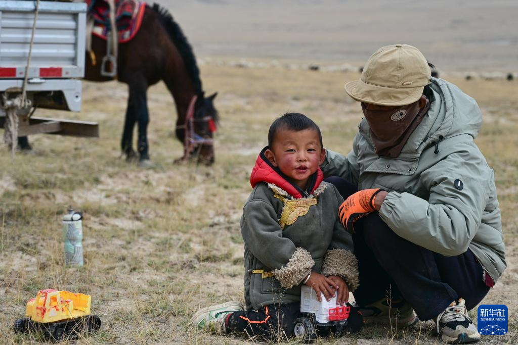 9月9日,在青海省海西蒙古族藏族自治州都兰县,牧民龙宫的小孙子在转场休息时玩汽车玩具。新华社记者 齐芷玥 摄