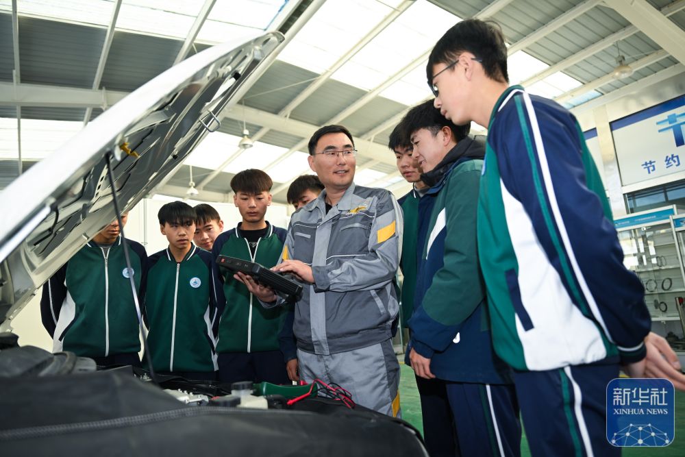 12月23日,在青海省海北藏族自治州职业技术学校,山东援青教师曹强(右四)在指导学生实操。