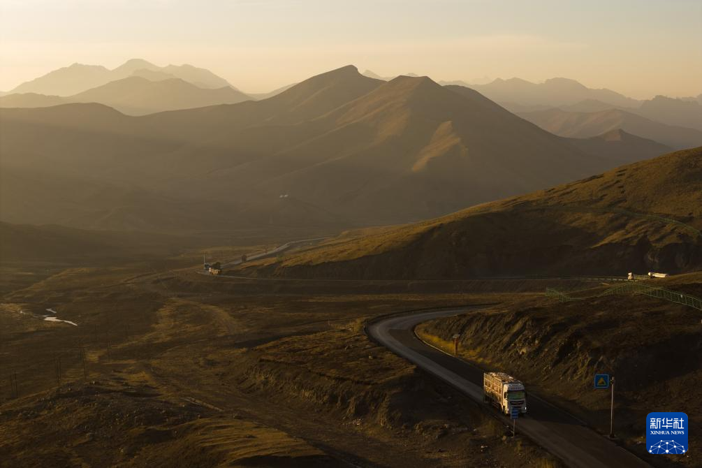 3月7日,在青海省海北藏族自治州祁连县峨堡镇,转运羊群的车辆驶进祁连山区(无人机照片)。新华社记者 张龙 摄